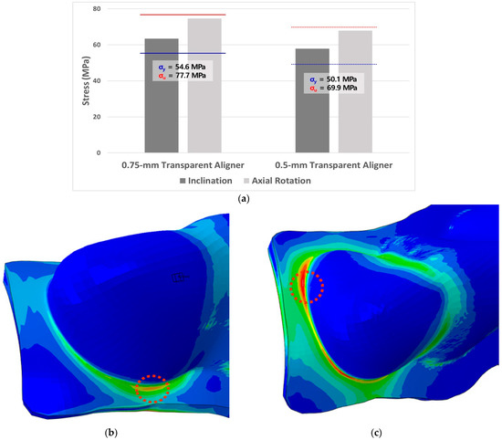 After orthodontic treatment analysis, the PVMS of the transparent aligners was analysed at the time of insertion, when this value was highest. In both inclination and axial rotation correction, the 0.75-mm and 0.5-mm transparent aligners caused greater stress than the yield stress of the transparent aligner material; however, the stress was lower than the ultimate stress. In treatment of lingual inclination, the 0.75-mm and 0.5-mm transparent aligners showed 16% and 14% increased stress, respectively, as compared to the yield stress.