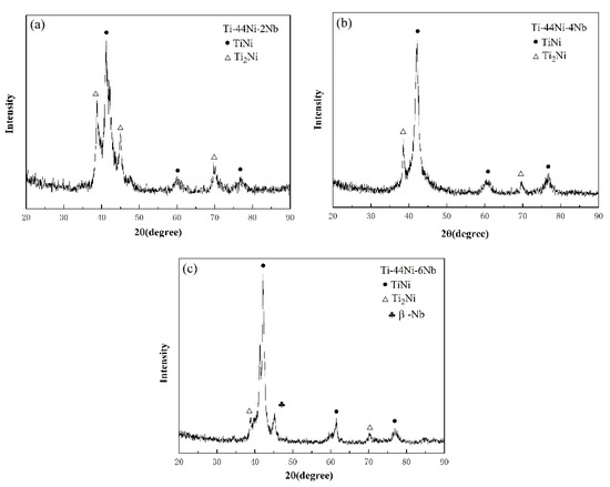 XRD patterns of: (a) TiNi44Nb2, (b) TiNi44Nb4, and (c) TiNi44Nb6 alloys.