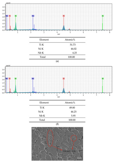 SEM surface morphologies of: (a) TiNi44Nb2, (b) TiNi44Nb4, and (c) TiNi44Nb6 alloys. EDS analysis for (d) TiNi44Nb2, (e) TiNi44Nb4, and (f) TiNi44Nb6 alloys, (g) the higher magnification view for (c).
