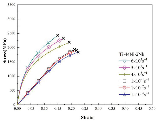 Figure 3, Figure 4 and Figure 5 show the mechanical response of the TiNi44Nb2, TiNi44Nb4 and TiNi44Nb6 alloys, respectively, under quasi-static and dynamic compressive loads. In general, the results show that for Nb additions of less than 4 at.%, an increasing Nb content led to a higher failure stress and failure strain. In other words, the interstitial insertion of the Nb atoms prompted a distortion of the TiNi lattice, which increased the lattice strain and impeded the movement of dislocations, thereby resulting in a solid solution strengthening effect. However, as the level of Nb addition was further increased to 6 at.%, the strength decreased and the ductility increased due to the formation of a soft β-Nb phase, as shown in Figure 1 and Figure 2.