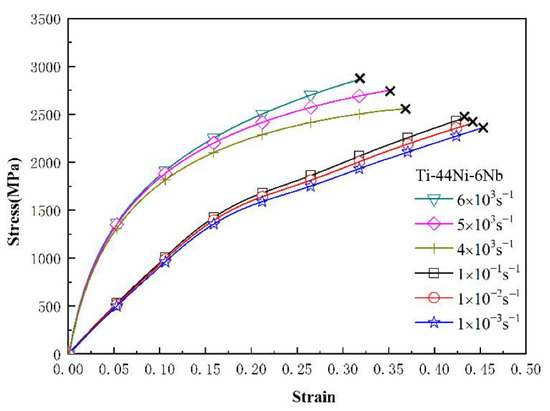 Low strain rate and high strain rate deformation curves of TiNi44Nb4 alloy.