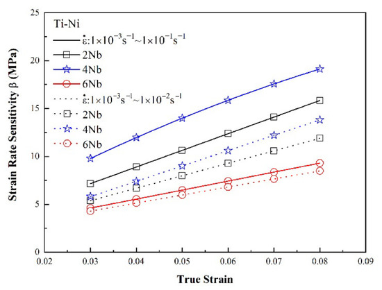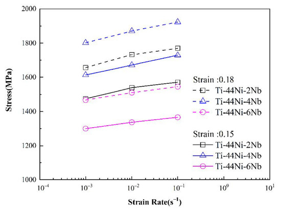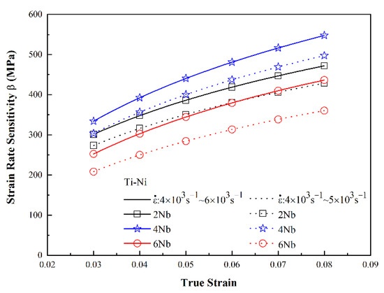 Figure 6 and Figure 7 show the variation in the flow stress with the strain rate for the three alloys as a function of the strain under static and dynamic loading conditions, respectively. It can be seen that, for both deformation regimes, the strain rate and Nb content had a significant effect on the plastic flow stress. Moreover, for a constant strain rate, the flow stress increased with increasing strain. Among all the alloys, the TiNi44Nb4 alloy exhibited the maximum plastic flow stress for all values of the strain and strain rate. The effect of the strain rate and Nb content on the mechanical response of the three alloys can be evaluated via the following strain rate sensitivity (β) [35]: