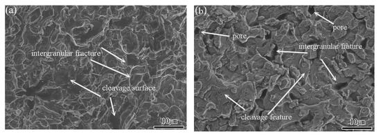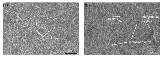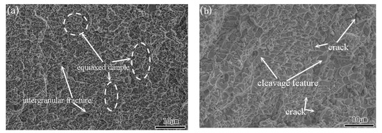 As shown in the stress-strain curves in Section 3.3, all the specimens failed under the considered quasi-static and dynamic strain rates. To investigate the failure mode for each sample, the facture surfaces were examined by SEM. Figure 10a,b show the fracture surface of the TiNi44Nb2 alloy under quasi-static and dynamic strain rates of 10−1 s−1 and 5 × 103 s−1, respectively. For both strain rates, the fracture surface contained multiple fracture planes and numerous cracks at the grain boundary, which suggests that the onset of specimen failure occurred at the grain boundaries. Overall, the results show that the failure mode was one of intergranular fracture (i.e., brittle failure). For the TiNi44Nb4 alloy, both facture surfaces contained intergranular fractures and granular equiaxed dimples. In other words, the fracture surfaces showed evidence of a mixed brittle-ductile failure mode (see Figure 11). For the TiNi44Nb6 alloy, the addition of a greater amount of Nb reduced the number of intergranular fracture features and increased the density (i.e., reduced the size) of the equiaxed dimples (see Figure 12). Overall, the OM images shown in Figure 10, Figure 11 and Figure 12 indicate that the addition of 2–4 at/% Nb resulted in a grain refinement effect, which prompted solid solution strengthening of the alloy with corresponding improvement in the mechanical performance. However, for a higher level of Nb addition (6 at.%), a soft β-Nb phase was formed, which reduced the strength of the alloy and increased its ductility.