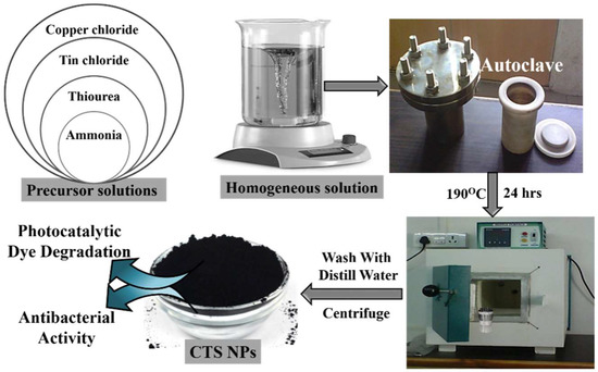 All of the chemicals utilized in the synthesis of CTS NPs are of analytical grade. All chemicals were purchased from Sigma Aldrich, Saint Louis, MO, USA. Briefly, 0.8 mmol of tin (II) chloride-dehydrate (Sncl2·2H2O), 1 mmol of copper (I) chloride (CuCl·2H2O), and 4 mmol of thiourea (CH4N2S) were individually dissolved in 30 mL of deionized water with constant stirring for 10 min. First, the CuCl2·2H2O solution was mixed into the SnCl2·2H2O solution and stirred for 15 min. Then, CH4N2S solution was slowly mixed with the above mixture with gentle stirring. A white precipitate was observed after adding CH4N2S. Then, the pH of the solution reached approximately 9.0 by using a liquor ammonia solution. To synthesize CTS NPs, the hydrothermal method was carried out in 100 mL Teflon-lined stainless-steel autoclave at a temperature of 190 °C for ~24 h (heating rate 5 °C/min). To increase the crystallinity of CTS NPs, the collected powder was washed a few times with distilled water, and the obtained precipitate was dried at 80 °C in a vacuum oven for 2 h (Figure 1).