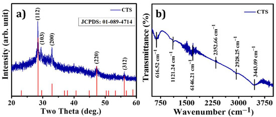 (a) X-ray diffraction pattern, (b) FTIR spectrum of CTS NPs.