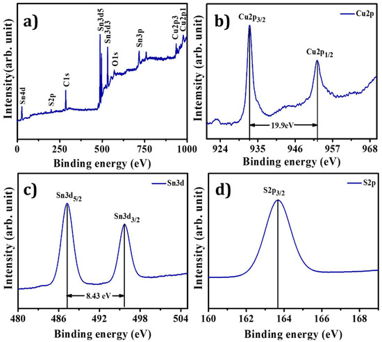 X-ray photoelectron spectroscopy investigated the oxidation states and bonding changes in CTS NPs (see Figure 3a–d). The XPS spectra highlight the occurrence of Cu, Sn, S, O, and C elements. The occurrence of carbon and oxygen could be possible due to the environment (see Figure 3a). Figure 3b shows peaks located at 932.60 and 952.50 eV having binding energy splitting of 19.9 eV, highlighting the presence of Cu1+ state. Figure 3c shows Sn 3d peaks, which occurred at 487.26 and 495.69 eV, with its peak separation of 8.43 eV confirming the Sn4+ state. The presence of sulfide species confirmed by the sulfur 2p3/2 peak occurred at 163 eV, which agrees with the presence of sulfide species in the S2− state (see Figure 3d). Thus, these results match reported data of CTS material in the literature [47,48,49,50].