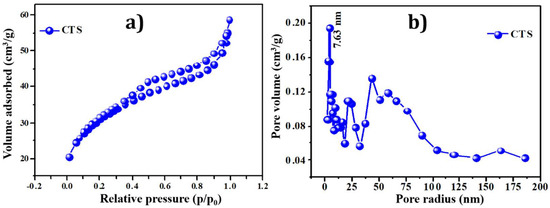 The photocatalytic dye degradation performance of the active electrode material is mainly dependent on the surface conditions. The surface area plays an essential role in dye degradation for light absorption at different incident angles. The specific surface area of CTS NPs prepared at 180 °C hydrothermal temperature is measured by BET analysis. The higher specific surface area and appropriate pore volume of prepared NPs are essential for getting the best electrochemical dye degradation performance [5]. As the high specific surface area provides the more significant electroactive sites for electrochemical reactions, and appropriate pore volume offers the easiest way for an intercalation/deintercalation process. Figure 5a provides the N2 adsorption–desorption isotherms measured for the CTS powder sample in the relative pressure (ρ/ρ0) range of 0.0–1.0. The curve shows the type IV isotherm attended by the H3 type hysteresis loop. This indicated the existence of mesopores in the sample, with the pore diameter ranging from 2 to 50 nm [53]. The analysis shows the presence of mesopores with specific surface areas of 87.31 m2 g−1 of CTS material. Meanwhile, the pore size was calculated using the BJH method, and the result was 7.63 nm. The surface area and pore size are positively related to photocatalytic activity. Therefore, the photocatalytic activity of CTS NPs was higher [5]. Figure 5b shows the Barrett–Joyner–Halenda (BJH) pore size distribution plot of CTS NPs. The maximum pore size distribution occurs within 2 to 50 nm. The results from BET analysis support the SEM morphology as the nanoplates-like CTS possess maximum surface area.