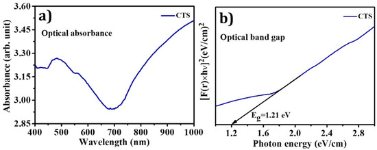 One of the essential characteristics of a promising photocatalyst is its optical properties. The band-gap is a significant factor of semiconductor materials, which decides the definite generation of carriers [54]. The UV-Visible diffuse reflectance absorption spectrum (DRS) of CTS NPs is illustrated in Figure 6a. The absorption spectrum of CTS NPs showed the characteristic band-gap absorption edge at 700 nm. This spectrum indicates that CTS NPs absorb the entire visible section of electromagnetic waves and that the tail is prolonged to a lengthier wavelength. This circumstance reflects the superior morphology of this sample, which allows for the scattering of incident light in the interior of molecules. This increases the photon path length and causes the reflection of incident light to shrink, a phenomenon known as the light-trapping effect [55]. The band-gap of CTS NPs was determined using the Kubelka–Munk (K–M) standard equation given below: