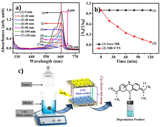 (a) UV-Vis absorption spectra of MB degradation with CTS as a catalyst, (b) plot of [At]/[A0] as a function of radiation time for CTS nanoparticles, and (c) schematic representation of the possible photocatalytic degradation mechanism under visible-light irradiation with CTS as a catalyst.