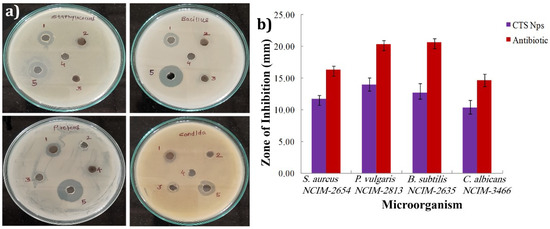 The water rectification process contains organic pollutants and many other contaminants available in the wastewater. These toxin materials have a fragment of microbes, and it was reported earlier that the growth of pathogenic bacteria in the water is mainly because of organic metals [68]. Therefore, it is found that the photocatalyst has the property of inhabitation ability of microbial contaminants [69]. Commercial antibiotic (50 μg/mL) and antibacterial activity of CTS NPs (50 μg/mL) were scrutinized, and a significant zone of inhibition was detected. Figure 8a demonstrates a photograph representing the antibacterial activity of CTS NPs against three bacterial strains, S. aureus (NCIM-2654) gram-positive, P. vulgaris (NCIM 2813), and B. subtilis (NCIM-2635) gram-negative, using streptomycin as a positive control and dimethylsulfoxide (DMSO) and distilled water as a negative control. Similarly, one fungal strain, C. albicans (NCIM-3466), was treated with fluconazole as the standard drug after incubation for 12 h. The antimicrobial potential of CTS NPs was studied using the agar gel diffusion method. Suspensions of CTS NPs drops were applied on round filter paper in a disc. Preparation of the DMSO medium was achieved by using the liquid auger suspension. The bacterial strains, i.e., S. aureus, P. vulgaris, B. subtilis, and one fungal strain, i.e., C. albicans, were prepared separately for each sample and control. The dilution of the CTS NPs sample was conducted as 2.5 mg/mL, and 10 μL drops of the sample were mixed in bacterial and fungal suspensions. The incubation of three bacterial and one fungal control suspensions was at 37 °C for 12 h. It can be deduced from the present study that CTS NPs have an excellent antimicrobial activity toward the three bacterial strains. S. aureus, P. vulgaris, B. subtilis and one fungal strain C. albicans. From the zone of inhibition (ZOI) values, CTS NPs were more efficient in inhibiting the growth of the bacterial strain P. vulgaris, as the maximum ZOI was 14.00 ± 1.00 mm. The ZOIs of CTS NPs against S. aureus and B. subtilis bacterial strains were 11.67 ± 0.58 mm and 12.67 ± 1.15 mm, respectively, as illustrated in Table 2. Similarly, the ZOI against the fungal strain C. albicans was 10.33 ± 1.53 mm.