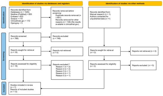 The electronic search retrieved a total of 1525 articles. 766 records were screened after duplicate removal and 18 remained after title and abstract evaluation. One additional article [34] was collected through manual screening and unpublished data of another article were obtained directly from authors [35]. After full-text assessment, another seven articles were excluded (Table 2).