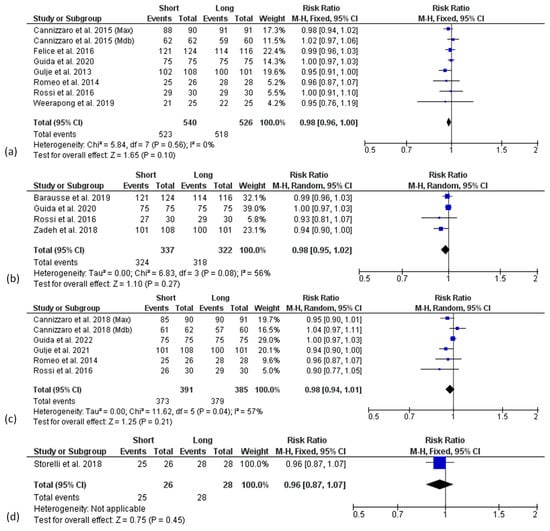 A meta-analysis regarding the biological complications (mucositis and peri-implantitis), and prosthetic complications (implant, prosthesis, abutment or screw fractures, screw loosening, and denture renewal), registered in the included studies was performed. Other reported complications, such as pain, soft tissue ulcerations and wound dehiscence, or loosening of cover/healing screws, were not included among the biological and technical complications, respectively. Data were analysed at the patient level. Three articles provided only implant-level data and were excluded from the analysis of biological [45,48] and technical [45,52] complications. A fixed effect model was used for all the analysis at each follow-up point. None of the 1-year follow-up articles reported patients suffering from mucositis or peri-implantitis. No difference for biological complications between short and long implant groups from 3 to 10 years of follow-up was found (Figure 7a–c).