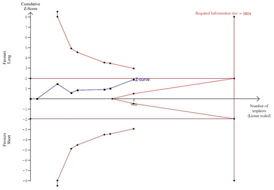Trial Sequential Analysis (TSA) was performed for the main outcome (implant survival), to evaluate the power of the meta-analysis and to adjust the results for type I and II errors. TSA 0.9.5.10 Beta software was used (Copenhagen Trial Unit Centre for Clinical Intervention Research Department, Copenhagen, Denmark). The fixed-effects model was selected for the meta-analysis. The required information size (RIS) and alpha-spending monitoring boundaries were estimated by setting type I and type II error at 5% and 20% (power of 80%), respectively. To calculate RIS, for both test (short implants) and control (long implants) arms, the incidence (positive events) was estimated according to the findings of the meta-analysis, without applying correction for heterogeneity. The corresponding graphics allowed to determine if the cumulative Z-curve (blue line) crosses the RIS threshold (vertical red line) and the trial sequential monitoring threshold (horizontal red line). If so, it was considered that the studies had an adequate sample size, and their results were valid. Otherwise, it was assumed that the available information was inadequate, and more evidence was needed.