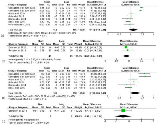 Forest plots reporting difference in means for Marginal Bone Level change (MBLc) between short and long implant groups at 1 (a), 3 (b), 5 (c), and 10 (d) years considering prosthetic loading (PL) as baseline.