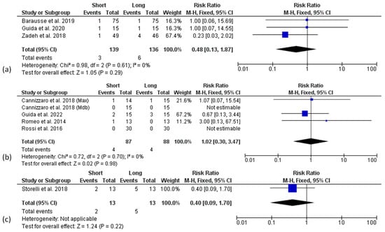 Forest plots (risk ratio, RR) for biological complication rate comparing short and long implant groups at 3 (a), 5 (b), and 10 years (c) of follow-up. RR > 1 indicated a higher complication rate for short than the long implants.