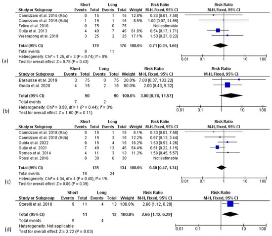 Forest plots (risk ratio, RR) for technical complication rate comparing short and long implant groups at 1- (a), 3- (b), 5- (c) and 10-year follow-up (d). RR > 1 indicated a higher complication rate for short rather than long implants.