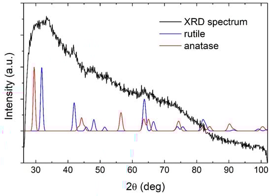 The laser ablation of metallic Ti target in water resulted in the synthesis of a colloidal solution of semiconductor TiO2 NP. The GIXRD measurements shown in Figure 1 revealed that TiO2 NP are amorphous due to the lack of appearance of any of the major Bragg peaks of TiO2 phases (theoretical peaks for rutile and anatase are shown for comparison). The ζ-potential of the produced TiO2 NP colloidal solution was measured to be 30 ± 1 mV, making the solution of moderate stability (aggregation and precipitation of nanoparticles appeared after two days). Therefore, TiO2 NP concentration can also be considered a homogenous and well-defined value in the as-prepared solution.