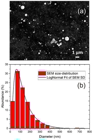 The morphology and size distribution of TiO2 NP were obtained using SEM imaging. A typical SEM image of TiO2 NP is shown in Figure 2a, where 5000 pulses were applied in ablation. It can be seen that TiO2 NP are spherical and with a broad range of sizes. For each number of laser pulses applied in ablation, the size distribution was obtained by measuring the diameters of 200 single nanoparticles from SEM images. It was found that the size distribution was similar for all tested numbers of pulses. The size distribution obtained from SEM images is shown in Figure 2b.
