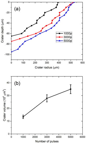 (a) Profiles of craters remained on the Ti target after ablation and (b) ablation crater volume dependence on the number of pulses.