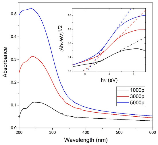 UV-Vis measurements shown in Figure 4 are performed to obtain the concentration CA of TiO2 NP in colloidal solution using the Beer–Lambert law. Indirect bandgap energies for each TiO2 colloidal solution are calculated from the photoabsorbance measurements using the Tauc plot as shown in the inset of Figure 4, and their values are 2.87 eV, 2.98 eV, and 3.08 eV for 1000, 3000, and 5000 laser pulses, respectively. The calculated indirect bandgap energies are close to the indirect bandgap energy 3.0 eV obtained in [] for amorphous TiO2 thin films but are also close to the bandgap energies expected for the most common TiO2 phases—rutile (3.0 eV) and to a lesser extent, anatase (3.20 eV) [].