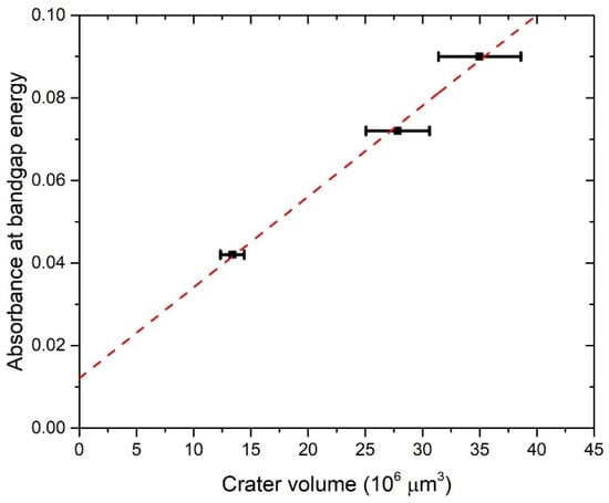 Figure 6 shows the dependence of absorbance at bandgap energy on the crater volumes. It can be seen that this dependence is linear, so it means that the average optical cross-section of TiO2 NP does not depend on the number of laser pulses. This result is expected due to the similarity in the TiO2 NP size distribution at a different number of pulses. Therefore, for each number of pulses, the same average optical cross-section can be inserted in Equation (7) for CA calculation. The extinction cross-section inserted in Equation (7) for the calculation of CA is taken from calculations made by using TiO2 refractive indices from Siefke et al. [] and has a value of = 5.42 × 10−10 cm2 at wavelength 390 nm (Figure 5), which corresponds to the bandgap of TiO2 used in the same paper. The selection of the paper by Siefke et al. [] is made due to the well-defined TiO2 bandgap, which is indirect—like the TiO2 NP in this paper. However, the difference in CA that would occur in the case of using TiO2 refractive indices from the other two papers (Sarkar et al. [], Bodurov et al. [,]) is included as the contribution to the uncertainty of CA. The calculated values of concentrations CA are: CA (1000p) = (1.8 ± 0.3) × 108 mL−1, CA (3000p) = (3.1 ± 0.5) × 108 mL−1 and CA (5000p) = (3.8 ± 0.6) × 108 mL−1.