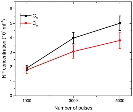 The concentrations of CV and CA as calculated here are both listed in Table 1 and shown in Figure 7 for each number of applied pulses. CA is close to CV, but slightly lower: 5% for 1000p, 22% for 3000p, and 24% for 5000p. Therefore, our proposed method for the determination of laser-synthesized TiO2 NP concentration from the size distribution and volume of the crater remained on an ablated target is verified, at least within the limits of obtained uncertainty, which are acceptable for many practical purposes.