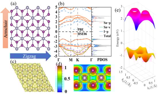 (a) Top view of the atomic structure of SnI2 monolayer. (b) The electronic band structures calculated with PBE and HSE06 hybrid functional potentials. (c,d) the 3D and 2D ELF maps. (e) The 3D electronic band structure calculated with PBE.