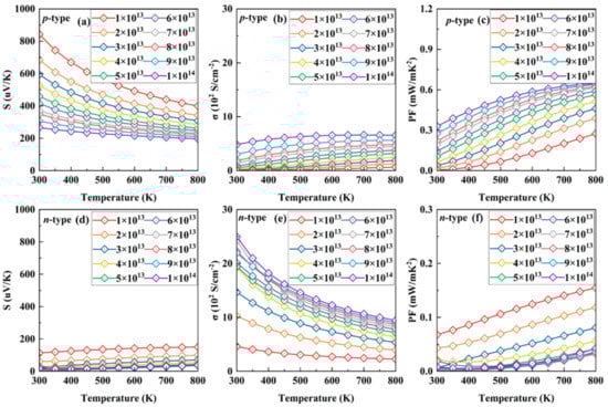 Seebeck coefficient, electronic conductivity, and PF as a function of temperature under various concentrations of p- (a–c) and n-type (d–f) doping.