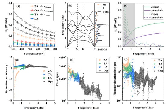 To explain the anomalous thermal transport behavior of monolayer SnI2, the cumulative lattice conductivity, and their derivatives, with respect to frequency at 300 K are calculated and presented in Figure 3c. Clearly, the κL is mainly caused by phonons of the cutoff acoustic part (the shadow region < 1.35 THz). Specifically, the contributions from ZA, TA, LA, and the optical branches are 51.21%, 15.14%, 10%, and 23.54%, respectively. For graphene, the low frequency (0–5 THz) also dominates the κL and the ZA mode, and contributes 75% to κL [54]. Comparing with graphene, the structure of the monolayer SnI2 lacks mirror symmetry. Thus, the mirror symmetry does not reflect whether the ZA mode dominates the thermal transport [55].
