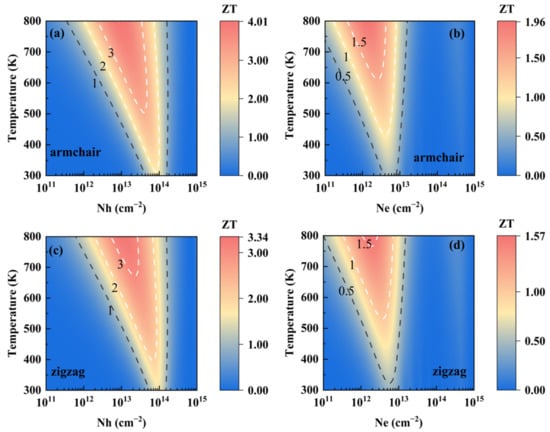 Contour maps of ZT as functions of both temperature and carrier concentration for monolayer SnI2: (a) p-type and (b) n-type along the armchair direction, (c) p-type and (d) n-type along the zigzag direction.