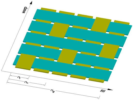 The RUC is defined as the smallest essential piece of a composite that keeps repeating itself over the whole material and it defines (at a meso-scale) the structure of the composite [31,32,33]. For example, the five harness satin (5/2/1) is a planar, orthogonal, square fabric made of two perpendicular tows, each consisting of a bunch of fibers. The tows laid down in the x direction of the lamina are called fills and the tows aligned at a right angle, in the y direction, are called warps; in Figure 1: