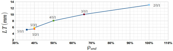 By looking at the data from Table 10, it can be seen that the LT is directly related to in particular and to the fabric type in general; see Figure 11. The plain-weave fabric (satin 2/1/1), which is the crimpiest of all the textiles (with ), requires the thickest laminate (13.026 mm), with the largest number of plies (32). At the other end, the satin 5/1/1 fabric has the smallest undulation density ) and the smallest LT (5.240 mm). In this situation, the number of layers (18) is not the smallest number from all the fabrics; this aspect can be explained by looking at the thickness of the ply, which is only 0.291 mm—the smallest number of all.