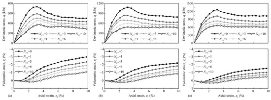 Dependence of deviatoric stress and volumetric strain on axial strain of tested CGS corresponding to different numbers of FTCs (modified after Ling et al. [18]): (a) σ3 = 30 kPa, (b) σ3 = 60 kPa, and (c) σ3 = 90 kPa.