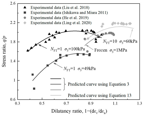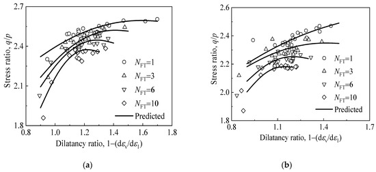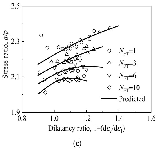 By substituting Equations (10)–(12) into Equation (3), Equation (13) was obtained, which can be used to predict the relationship between the stress ratio and dilatancy ratio corresponding to any confining pressure and any number of FTCs.