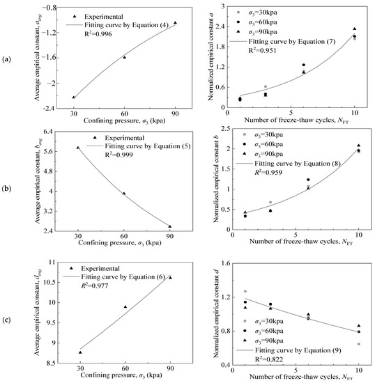 - The best fit a and c values increase in the form of an exponential function with increasing σ3, while b values exhibit the opposite trend. On the other hand, the changing law of the a and b values increase with increasing FTCs following a form of an exponential function. Meanwhile, c values exhibit the opposite trend. It is interesting to note that the a, b, and c values vary between −0.37 and −4.53, 1.82 and 11.03, −4.32 and 1.41, respectively.