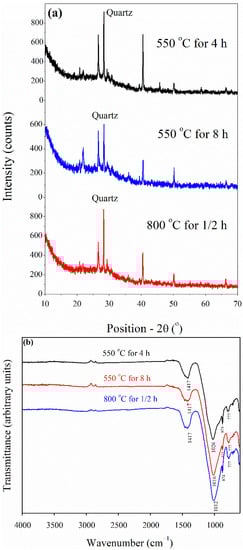 (a) XRD pattern and (b) FTIR of WSA after heat treatment at 550 °C for 4 and 8 h, and at 800 °C for 30 min.