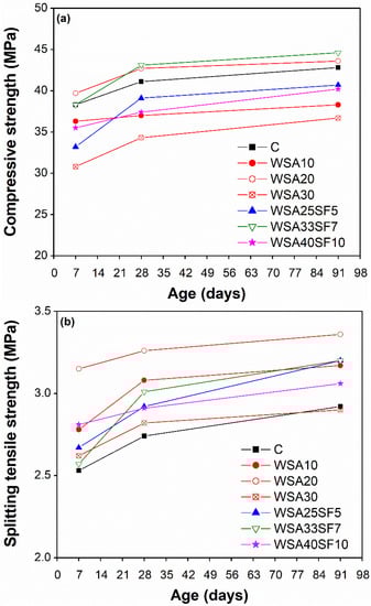 In contrast to compressive strength, Figure 2b demonstrated a higher splitting tensile strength (STS) development for all concretes tested (binary and ternary) than that of CC. However, among binary and ternary mixes, their trends of STS development with respect to cement substitutions remained similar to that of compressive strength development. Moreover, similar to the compressive strength, the evolution of STS for WSA20 and WSA33SF7 was significantly higher as compared to CC and all other binary and ternary mixes. The only exception was at 7 days when WSA33SF7 exhibited higher STS than only CC. It is worth mentioning that the WSA20 concrete exhibited highest STS among all the concretes tested at all ages.