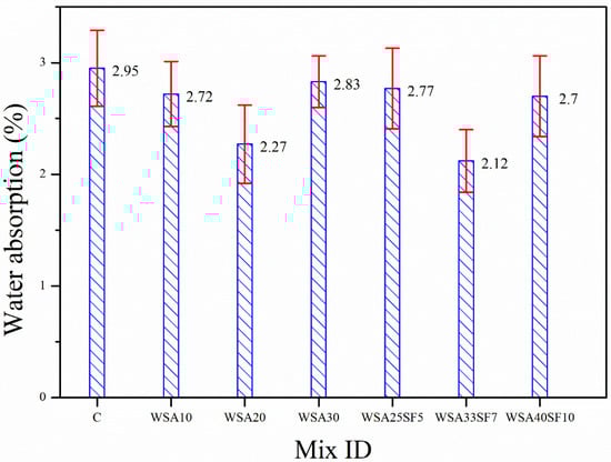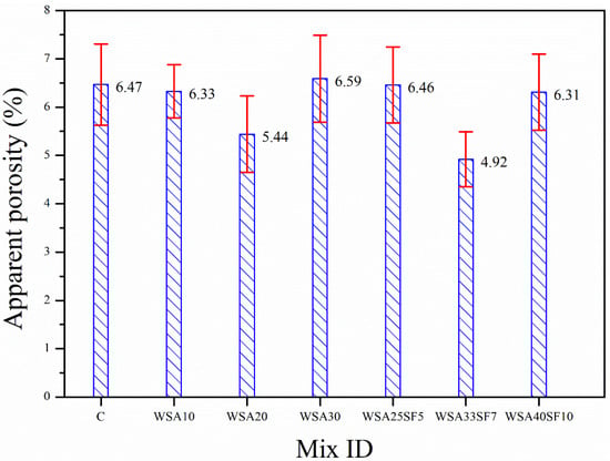 The comparison of the other important properties (WA and AP) of the binary and ternary concrete mixtures with that of the CC was also performed in addition to the strength characteristics. This is because the durability of the hardened concretes can be indirectly assessed based on the WA and AP values. The different trends of changes in the WA and AP according to various amounts of cement substitution with WSA alone (binary concretes) and WSA with SF (ternary concretes) are depicted in Figure 3 and Figure 4. It can be seen in Figure 3 that a lower WA compared to CC was exhibited by all binary and ternary concretes regardless of the amount of cement substitution, which is attributed to their lower AP values as compared to CC (Figure 4). A decrease in the WA of binary concrete mixtures with increasing percent substitution of cement with WSA was observed up to a certain replacement level (20%). Thus, a slightly higher WA was exhibited by binary concrete having 30% WSA when compared with other binary concretes having 10% or 20% WSA (Figure 3). These binary concretes also demonstrated a similar trend of AP (Figure 4). A slightly higher value of AP exhibited by concrete containing a high amount of WSA (30%) is probably due to a relatively slower rate of the pozzolanic reaction owing to replacement of high percentage of cement with WSA. On the contrary, ternary concretes having high cement substitutions with blends of WSA and SF demonstrated a remarkable decrease in WA and AP values. The results demonstrated that, despite similar cement substitutions (30%), the ternary mix WSA25SF5 exhibited slightly lower WA and AP to that of corresponding binary mix WSA30. However, contrary to this, the WA and AP of this ternary mix were slightly higher than the other binary mixes with 10% and 20% WSA. Increasing the cement replacement from 30% to 40% in ternary concrete (WSA33SF7) resulted in further decrease in WA and AP values. The results demonstrated that the ternary concrete WSA33SF7 with an even higher percent replacement of cement exhibited lower WA and AP than the ternary concrete WSA25SF5 and all binary concretes having relatively lower cement substitutions (10%, 20%, or 30%). This was because SF particles of very fine size leads to significant pore refinement in ternary concrete mixtures compared to WSA. The ternary concrete having a very high cement substitution of 50% (WS40SF10) yielded slightly higher WA and AP values when compared to those of WSA33SF7 with relatively low cement substitution (40%). This was due to potentially slower rates of pore refinement and pozzolanic reaction in WSA40SF10 concrete owing to high cement substitutions.
