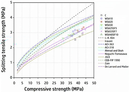 A correlation between experimental compressive and tensile strengths showed close agreement to models proposed by Noguchi–Tomosawa and De Larrard and Malier. Based on the results of current findings, it is recommended to use these models to properly estimate the tensile strength of tested concretes containing WSA alone or WSA jointly with SF, except the CC and WSA33SF7, as the JSCE model demonstrated a close agreement for these two concrete mixes. In addition, the JSCE model safely predicts the tensile strength of other binary and ternary concrete mixes with their slightly underestimated values.
