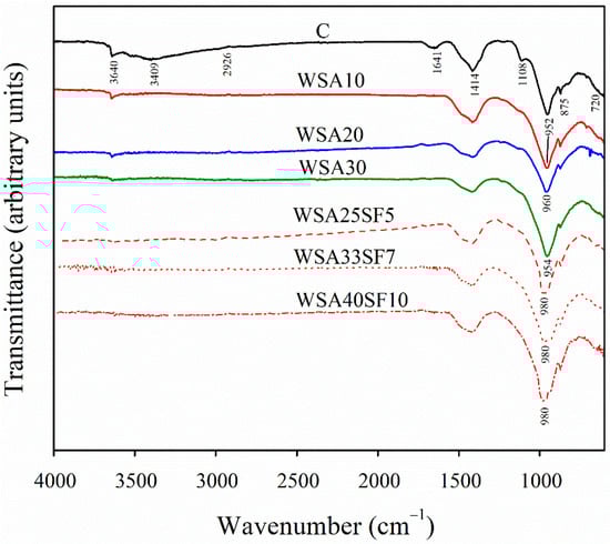 As illustrated in Figure 7, all the paste samples show appearance of IR bands at the same location; however, their intensities differ. This is attributed to the formation of hydration products such as C-S-H and C-H []. The peaks from 900 to 1100 cm−1 are associated with vibrations of Si-O bands in C-S-H phase []. The IR bands show a higher relative intensity of the Si-O band in paste samples containing 20% WSA (WSA20). Further, the samples of ternary blends having WSA and SF showed better results than those of control and binary mixes. This shift in the Si-O band is associated with polymerization of silica. A slight shift (960 cm−1) was detected in WSA20. On the other hand, the ternary concrete samples with different percentages of SF (5%, 7%, and 10%) showed a broader and significant shift (980 cm−1). A shift toward a higher wavenumber in the spectrum of binary and ternary pastes suggests formation of a high amount of C-S-H gels. A large amount of C-S-H gels are produced from the nucleation sites provided by the fine particles of SF, as also observed earlier through SEM–EDS analysis. The development of high compressive strength in these mixes can be linked to the formation of a large amount of C-S-H gels. Moreover, the peaks at 720, 875, and 1415 cm−1 are associated with calcite formed as a result of carbonation [].