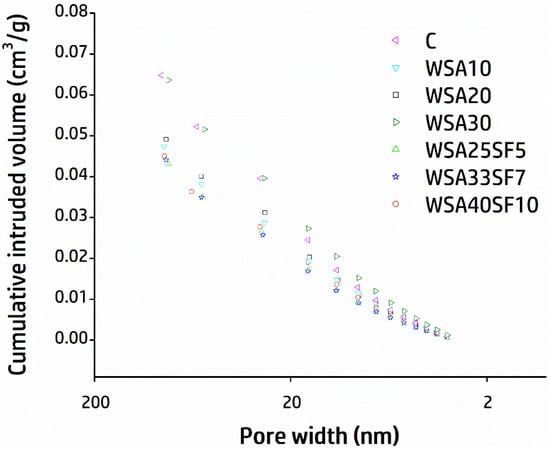 Comparison of the cumulative nitrogen intrusion volumes versus pore widths for control, binary (C/WSA), and ternary (C/WSA/SF) paste samples after 91 days of curing.