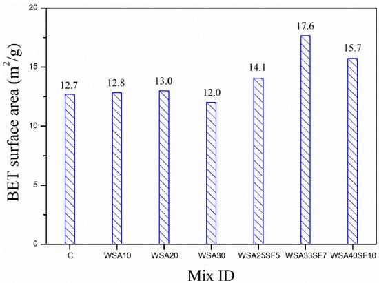 A comparison of Brunauer–Emmett–Teller (BET) surface areas between control and other binary and ternary mixes is presented in Figure 9. All ternary mixes exhibited higher BET surface areas as compared to those of binary and CC. Similar to the least amount of nitrogen intruded volume, WSA33SF7 demonstrated a larger BET surface area (17.6 m2/g) as compared to all other mixes. An increased BET surface area of the ternary mix indicates its improved and denser microstructure of C-S-H gels [,]. As described in the preceding section, SEM analysis with EDS demonstrated a dense cementitious matrix with few pores. In general, BET surface area increased with increasing percent of WSA and SF in ternary mixes, except for WSA40SF10 (15.7 m2/g), which showed a slight reduction that could be due to a high amount of cement substitution leading to a large amount of unreacted WSA in the mixture []. Similar to ternary mixes, binary mixes, especially those containing relatively low percentage of WSA such as WSA10 (12.8 m2/g) or WSA20 (13.0 m2/g), also showed slightly larger BET surface areas than that of control (12.7 m2/g), which ultimately had led to their improved microstructure of C-S-H gel. However, contrary to this, BET surface area decreased with further increase in percent of WSA (more than 20%) as was observed for WSA30 (12.0 m2/g). This clearly indicates the presence of unreacted WSA that had caused the hydration products to jam the pores and form a porous paste matrix. These results suggest a restricted use of WSA in binary mixes by not more than 20% when used as a sole substitute of cement.