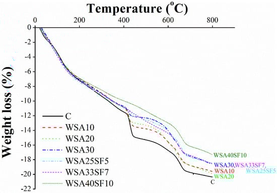 The thermal decomposition of 91-day cured cement paste samples of control, binary, and ternary mixtures was performed by TGA to evaluate the effect of WSA and SF on the amount of C-H (%), which occurred due to the weight loss between 400 and 500 °C [,]. Based on the TGA results, a comparison of weight loss (%) with respect to temperature is presented between control, binary, and ternary mixes (Figure 10). Consequently, using the TGA results, the amount of C-H for different mixes and their normalized C-H (%) values with respect to OPC was calculated, as listed in Table 7. The normalized C-H values for each mix were calculated by dividing their C-H values with their respective OPC (%) content.