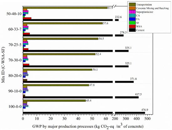 The GWP per unit volume of concrete (CO2-eq/m3) mixes decreased with decreasing amount of Portland cement simultaneously with an increase in amounts of SCMs. The highest GWP of 533 was generated by the control mixture (100% OPC) while the least GWP, only 313, was produced by the ternary concrete mixture (WSA40SF10) having 40% WSA jointly with 10% SF and only 50% OPC.