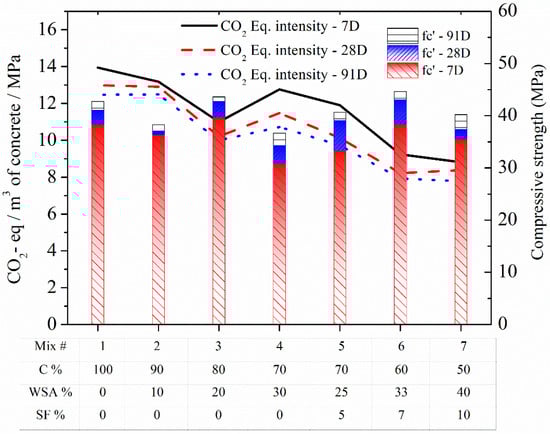 Regardless of aging, all the binary and ternary concrete mixes containing SCMs (WSA or WSA with SF) exhibited lower CO2-eq intensities as compared to CC, with the only exception of a binary mix having 10% WSA that showed almost identical CO2-eq intensities to that of control at later ages of 28 and 91 days. Furthermore, as compared to binary, ternary mixes having WSA together with SF showed good potential for further reducing the normalized CO2-eq intensities/MPa at all ages (7, 28, and 91 days). The ternary mixes containing highest percentages of SCMs, at 40% (WSA33SF7) and 50% (WSA40SF10), resulted in lower CO2-eq intensity/MPa as compared to that of CC, regardless of aging. Consequently, it may be safe concluding that the efforts for using larger amounts of regionally available SCMs can have an important positive effect on producing green concretes together with reduced GWP without compromising any strength potentials.