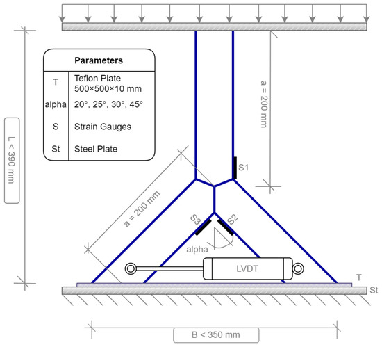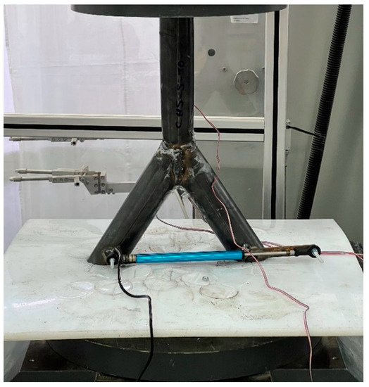 Next to the strain gauges, a sensor was connected to the specimen to measure the horizontal deflects. This sensor is named “Linear Variable Differential Transformer” (LVDT). The linear and axial movement was converted by electric coils into an electric signal. The boundary conditions were set as simple supported. To block the global horizontal deflections, a Teflon [26] plate with a thickness of 10 mm was located under the specimen. When the compression force affected the joint, the ends of the braces punched to the plate without perforating the material. The horizontal sliding was blocked. Next to the axial compression, bending was induced due to the beveled ends of the branches.