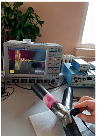 Before the compression tests, a set of non-destructive tests was performed in the laboratory. The reason was to check the quality of welding lines because they were constructed by hand and not by robotics. Under large defects, the specimen will not be usable. In the first step, the specimens were visually inspected to detect imperfections and/or large defects regarding the welding line. In the second step, a liquid test was executed. Due to capillary forces, open cracks or pores were detected. The welding line was cleaned, degreased with the liquid U87, and taped. The penetrating liquid U88 was sprayed onto the surface. The penetration time was 25 min. The developer liquid U89 was applied. If any marks (open cracks in the surface) arose, the specimen had to be renewed. Third, to find deflects inside the welding line, the weld was inspected by ultrasonic waves (Figure 3). An ultrasonic pulser-receiver with 4 MHz and 10 mm diameter was used. This method is based on the ultrasonic reflection method. In Figure 3, the results of a measurement are shown as an example on the oscillator. After starting the test, calibration and finding the position, the amplitude decreased rapidly. If the amplitude was high relative to the calibration amplitude, deflects would be present and the specimen had to be renewed. Table 1 shows the devices used for the experimental tests. After the non-destructive tests were done, the compression tests were executed.