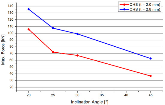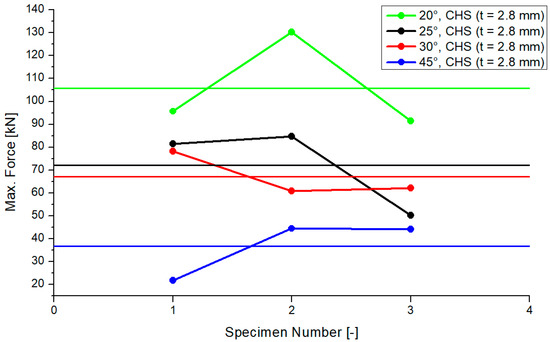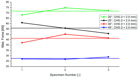 In Figure 5, the results for the maximum compression force of the “CHS t = 2.0 mm” models are presented. The results are shown for the three tested samples and for each inclination angle system. The range of the differences of every test was small. The horizontal lines in the colors of each inclination model represent the average values. The average values were similar for the 25° and 30° models, including a delta of 9 kN. The differences between the 20°/25° and 30°/45° models were 16 kN and 18 kN. The standard deviation was as follows: 3.36 (20°), 5.05 (25°), 3.98 (30°) and 1.18 (45°). Figure 5 shows that the maximum compression force will become smaller if the inclination angle increases.