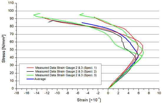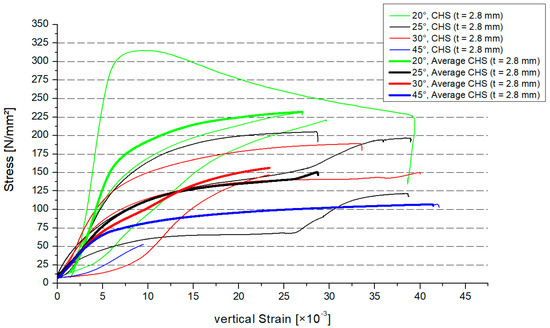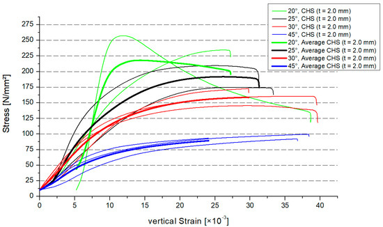 Figure 6 shows the stress–strain distribution of the circular hollow section profiles with 2.0 mm thickness, (CHS t = 2.0 mm). In combination with the cross–section area, the stress regarding the overall model was calculated. In Section 4, there is a comparison of the local stresses between the numerical and experimental model. In Figure 6, there are the results for every specimen (two results were lost). The average value for the three specimens was shown as a thicker graph, depending on the inclination angle. The range of the maximum strains was small. The different graphs, which represent the models, had a smooth behavior. The maximum resistance will decrease if the inclination angle increases. The behavior of the graphs for the stress–strain is similar to the findings from another experimental study [27].