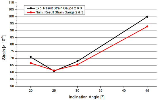 Numerical simulations were executed to find a feasible model for a design engineer to calculate fully overlapped steel joints with on-top connection. This study adopted geometrical models and material properties. The inclination angles were set to 20°, 25°, 30°, and 45°. The member lengths were superimposable. The numerical results were verified by the results of the experimental tests. The software Ansys [28] was used to simulate the Y-joints. The material was superimposable with the material in Section 3. The geometry was created by the use of three beveled pipes, connected by a 3D, 3-mm-fillet weld. The pipes had a gap of 1–2 mm including a phase. This ensured that there is no contact between the pipes. The force was only transferred through the welding line. For the numerical model, the contact between the pipes was set as frictionless to adopt this behavior. Due to the welding process, distortion in the microstructure can arise. This effect can result in an attenuation of the node. The heat-affected zone had a greater influence on the fatigue design of the node. The frictionless connection of the members was a numerical approach, which is on the safe side designing a node. Due to this, the effect of welding distortion was neglected in the numerical model. The boundary conditions were set as simple supported, combined with horizontal blocking of the braces’ ends. This imitated the effect of the Teflon [20] plate. The chord’s end was affected by an axial compression force, which was defined by the maximum compression of the laboratory tests. The value was calculated as an average result of three specimens. The mesh was set as 10 mm tetrahedral elements with a quadratic shape function. A refinement of 1.3 mm solid elements was set to the welding line area. In the literature, this mesh was verified for comparable systems [3,4,29]. To compare the quality of the mesh, a mesh metric evaluation was done. The geometrical conditions of the element shapes were compared to common limit values of the literature. In this case, the results of the “CHS t = 2.8 mm” with inclination of 25° model are presented. The skewness was less than 1 and tended to zero. The mean value was 0.273. The aspect ratio had a maximal value of 344, which is smaller than the common limit of 1000. The mean value was 2.04. The Jacobian value should be smaller than 30. The maximal value of the numeric model was 5.1, with an average of 1.05. Overall, the quality of the elements was 0.805. Due to the refinement of the mesh, the total number of elements was reduced. As an example, the number of nodes was 140,389 and the element number was 83,169 in the case of the 2.8 mm-30° model. Figure 10 shows the distribution of the von-Mises stresses on the surface of a specimen. The maximum stresses arose at the welding line between both braces. The deformation is shown in Figure 10. The deformation shape in the node and stress distribution was superimposable with the laboratory test results. Due to the force fitting of the specimen into the elastic 10 mm Teflon material, the measurements of the global deformation values were not comparable to the numerical results. The offset varied between the tests. The deformation shape of the node (Figure 4) fit the numerical result. The deformation was not centrally compressed, such as in experimental studies regarding standard defined T-joints [30]. Due to the round shape of the welding line, it was not possible to fix the strain gauge directly at the welding line. The strain gauges were fixed closely to the welding line. The stress/strain results were compared for this position. The values were measured for multiple positions, which are explained in Figure 1. Figure 11 shows the measuring data of the strain gauges 2 and 3 as an example for the different inclination angle models. The scatter was visualized for each specimen. The difference between the strain gauges was small due to the symmetrical geometry. Due to this, an average value was calculated for each system to compare it to the numerical model. Figure 12 shows a comparison between the results of the numerical and experimental analyses in the case of a position where the maximal stresses were expected. The results for the 25° modes were nearly superimposable. However, the numerical results were in good agreement with the experimental results.